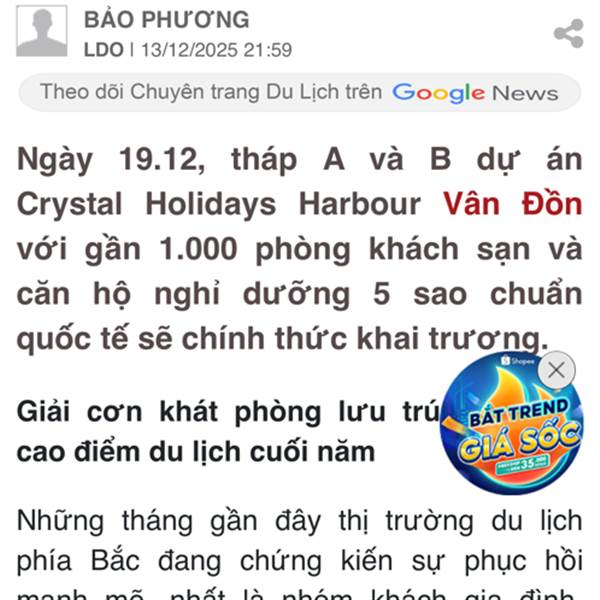 Ngày 19/12 tới đây, hai Tòa tháp A, B dự án Crystal Holidays Harbour Vân Đồn với gần 1.000 phòng khách sạn và căn hộ nghỉ dưỡng theo tiêu chuẩn 5 sao sẽ chính thức khánh thành, tạo điểm nhấn du lịch cho Đặc khu Vân Đồn, đồng thời bổ sung kịp thời nguồn cung phòng lưu trú cao cấp cho thị trường nghỉ dưỡng phía Bắc.