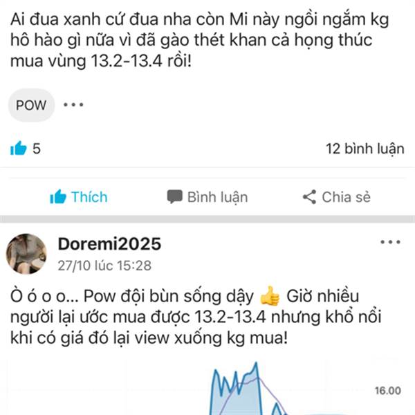 Ò ó o o… Pow đội bùn sống dậy 👍 Giờ nhiều người lại ước mua được 13.2-13.4 nhưng khổ nổi khi có giá đó lại view xuống kg mua!