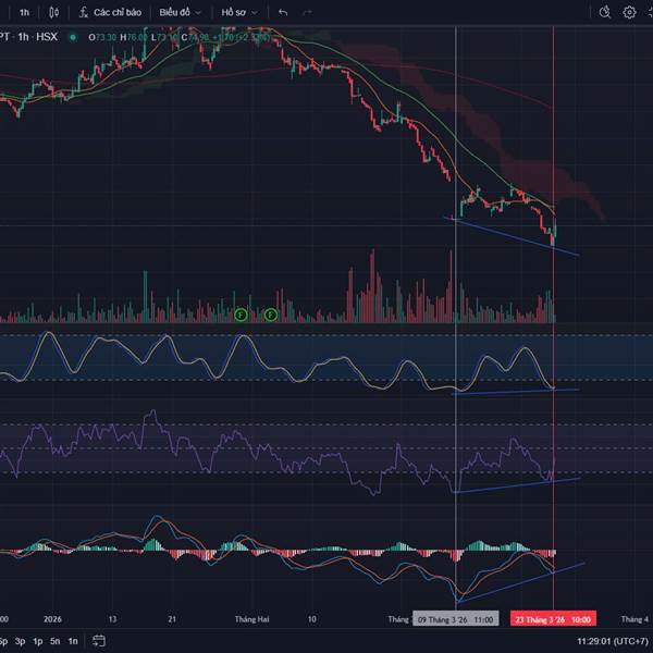 Phân kỳ dương trên 1h Chart. Giá FPT Lower low trong khi các chỉ báo MACD, RSI, Stoch lại Higher Low nhé các bác. XÚC!