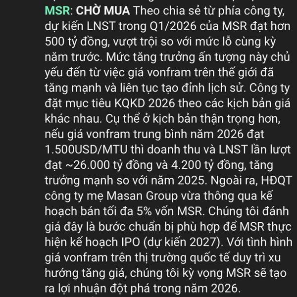 Theo TCBS lợi nhuận sau thế của MSR q1 2026 dự kiến hơn 500 tỷ. Vậy là chắc cú lợi nhuận q1 này không dưới 500 tỷ. Theo TCBS trong kịch bản thận trọng 2026 lợi nhuận sau thuế ít nhất phải hơn 4200 tỷ ...Thêm