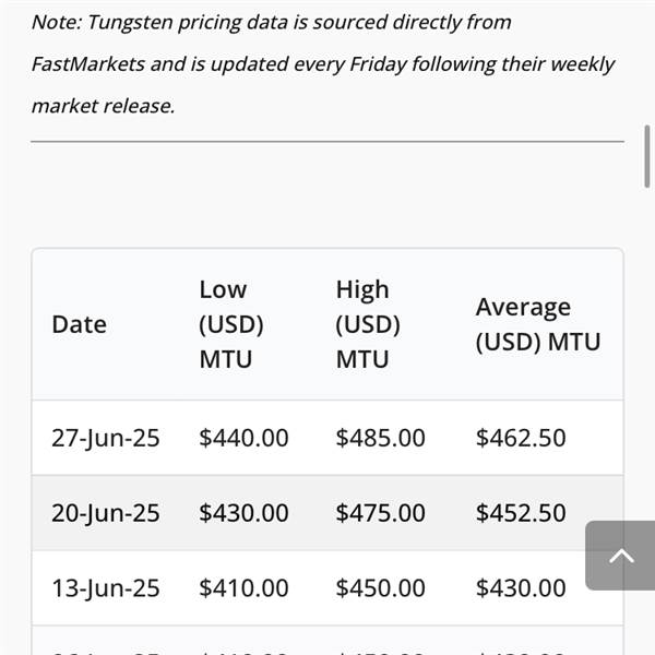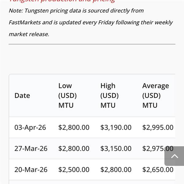 Đã có giá Vonfram hôm nay trên FastMarkets, tiếp tục tăng, giá trung bình sắp chạm ngưỡng 3000 usd. Trong vòng 10 tháng giá trung bình đã tăng gấp 7 lần.