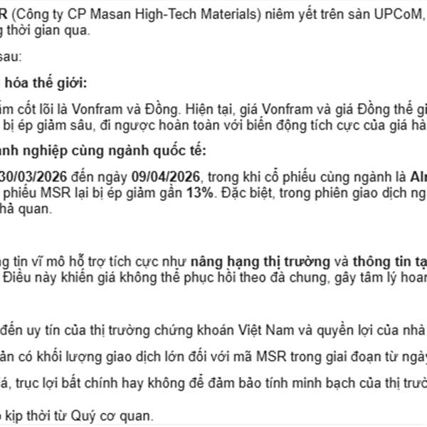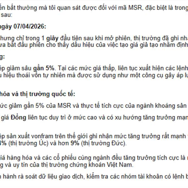 Tao đã gửi email phản ánh dấu hiệu giao dịch bất thường và đề nghị kiểm tra hành vi thao túng giá đối với mã cổ phiếu MSR tới 3 cơ quan dưới đây: - Ban Giám sát thị trường chứng khoán - Ủy ban Chứng kh...Thêm