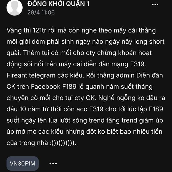 Vàng lên 141tr 1 cây rồi mà vẫn……… :)))))))))))) Cũng có nguyên văn vậy thôi. Ai đọc mà hiểu thì MAY MẮN ai cố chấp không hiểu thì 1 là Môi giới chuyên phái sinh 2 là Cò mồi phái sinh cty CK 3 là mấy ...Thêm