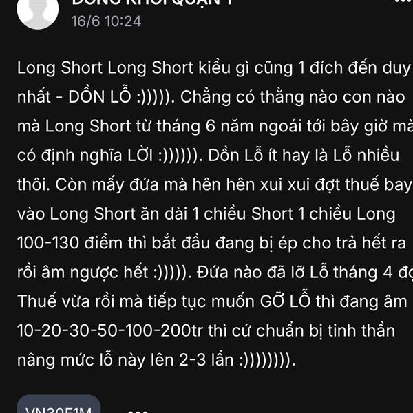 Long hay Short Short hay Long thì hết 1 năm cũng có đứa nào lời đồng nào đâu mà chơi quài :))))))))). Ước được về vốn gốc ban đầu lần đầu tiên bỏ tiền vô Tk đuôi phái sinh là mừng rớt nước mắt rồi chứ...Thêm