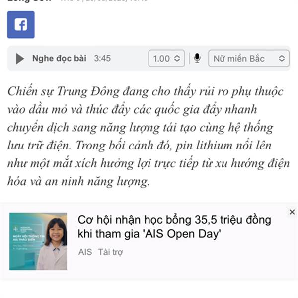 Chiến sự Trung Đông đang cho thấy rủi ro phụ thuộc vào dầu mỏ và thúc đẩy các quốc gia đẩy nhanh chuyển dịch sang năng lượng tái tạo cùng hệ thống lưu trữ điện. Trong bối cảnh đó, pin lithium nổi lên như một mắt xích hưởng lợi trực tiếp từ xu hướng điện hóa và an ninh năng lượng.