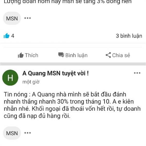 Tin nóng : A Quang nhà mình sẽ bắt đầu đánh nhanh thắng nhanh 30% trong tháng 10. A e kiên nhẫn nhé. Khối ngoại đã thoái vốn hết rồi, tự doanh cũng đã nạp đủ hàng rồi.