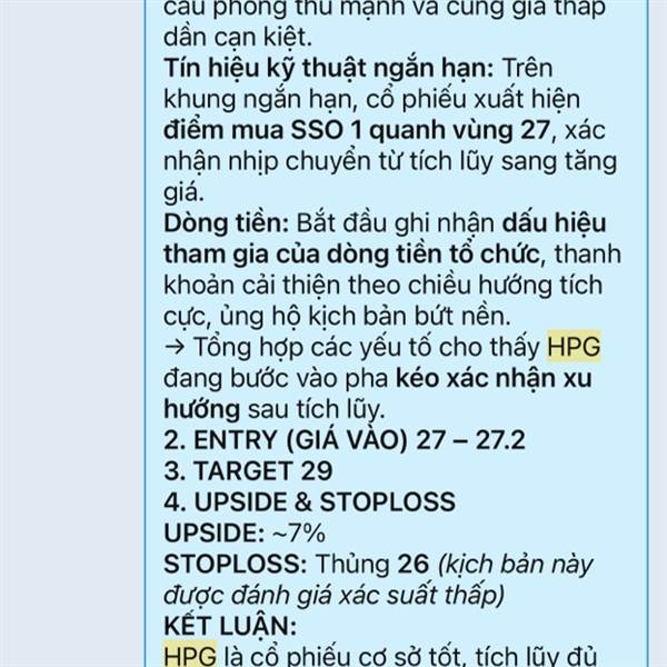 KHUYẾN NGHỊ CỔ PHIẾU HPG 1. LÝ DO KHUYẾN NGHỊ Cấu trúc tích lũy: HPG đang ở giai đoạn cuối của pha tích lũy, vùng giá 26 đã được kiểm định nhiều lần nhưng không bị xuyên thủng, cho thấy lực cầu phòng th...Thêm