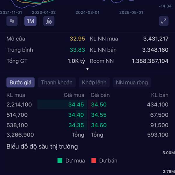 Giờ mà chỉ 2 lệnh mua, mỗi lệnh 1.000.000 cổ phiếu SSI thì nhiều bạn mua lắm đây. Đáy 2 xác nhận 34.8 rồi nhé, vượt mây 36-37.5 thì sẽ lên được 39-39.5 đấy