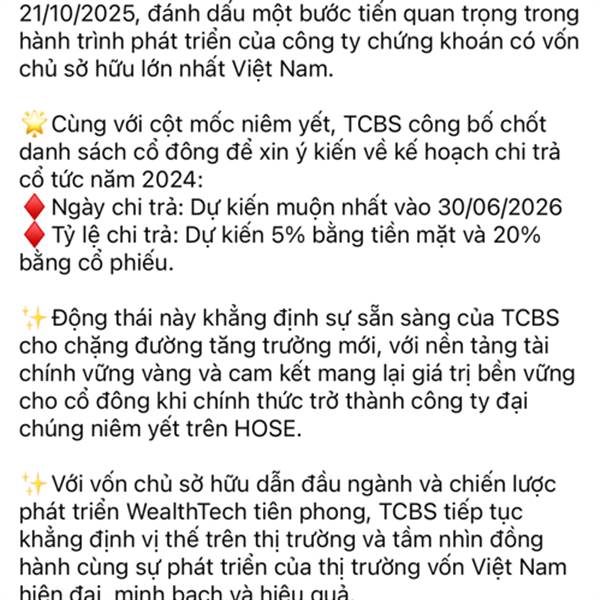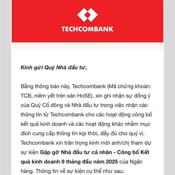- 23/10 TCB tổ chức gặp gỡ nhà đầu tư - công bố kết quả kinh doanh.