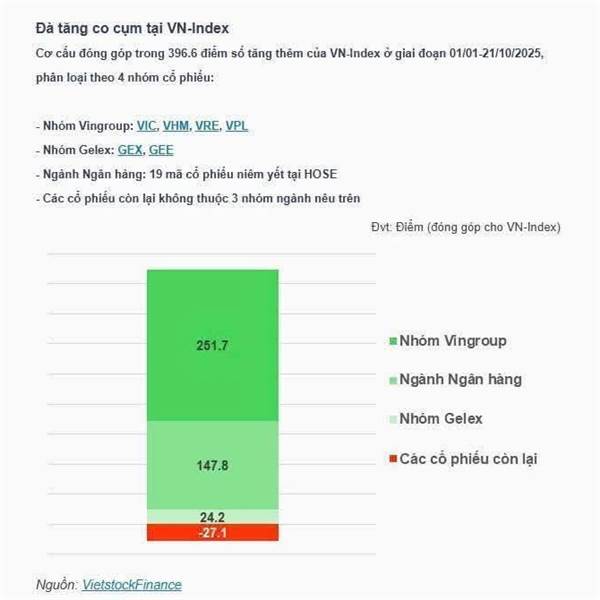 Theo dữ liệu trong biểu đồ của VietstockFinance, chúng ta có thể rút ra một số nhận định về cấu trúc tăng điểm của thị trường chứng khoán Việt Nam trong giai đoạn 01/01 – 21/10/2025 như sau: