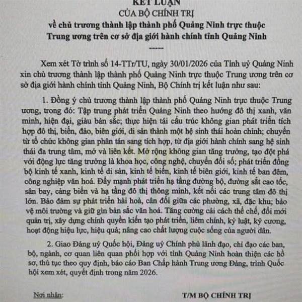 Bộ Chính trị đồng ý chủ trương thành lập thành phố Quảng Ninh trực thuộc Trung ương trên cơ sở địa giới hành chính tỉnh Quảng Ninh.