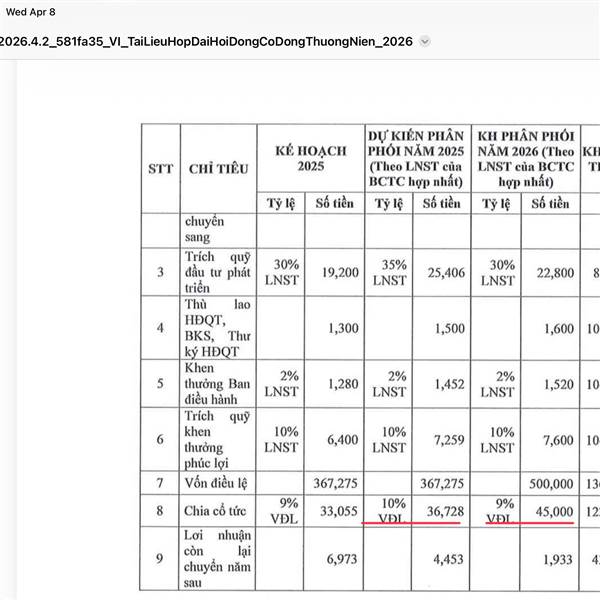 Sau khi đọc tài liệu đhcđ 2026 thì chốt lại: KH Doanh thu LN 2026 chắc chắn đạt, dư ra bao nhiêu tùy tâm lđ nhe ae. Cổ tức năm nay 1k, năm sau dự cỡ 1k luôn dù kh chỉ 900đ.