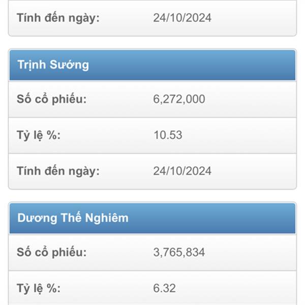 Thi hành án cưởng chế cp ccl ngày 7/3/2024 sao đến ngày 24/10/2024 T Sướng vẫn là cổ đong lớn nám 10,53% ccl Ai biết giài ghích giùm Và nếu thật sự T Sướng còn nắm 10.53% cp ccl thì kịch hay còn chưa ...Thêm