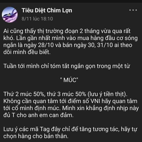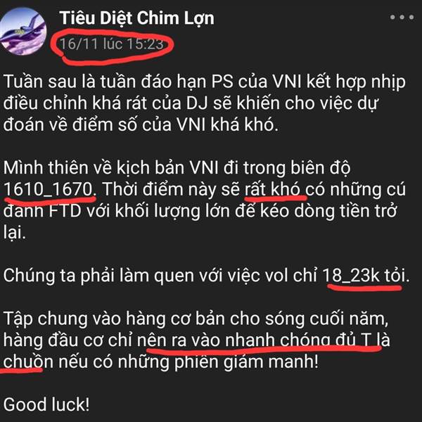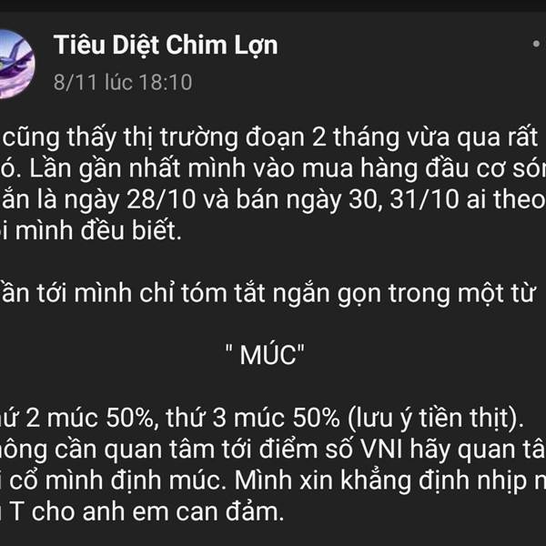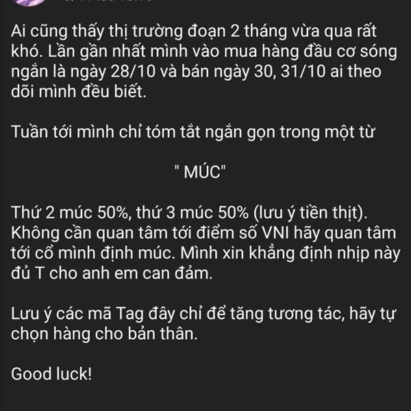 Ai cũng thấy thị trường đoạn 2 tháng vừa qua rất khó. Lần gần nhất mình vào mua hàng đầu cơ sóng ngắn là ngày 28/10 và bán ngày 30, 31/10 ai theo dõi mình đều biết.