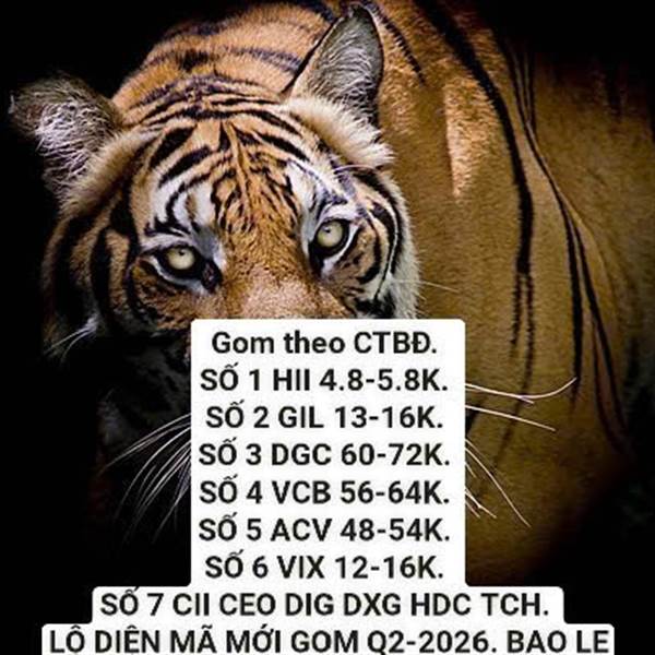 Gom theo CTBĐ. SỐ 1 HII 4.8-5.8K. SỐ 2 GIL 13-16K. SỐ 3 DGC 60-72K. SỐ 4 VCB 56-64K. SỐ 5 ACV 48-54K. SỐ 6 VIX 12-16K. SỐ 7 CII CEO DIG DXG HDC TCH. LỘ DIỆN MÃ MỚI GOM Q2-2026.