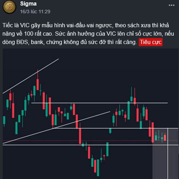Tiếc là VIC gãy mẫu hình vai-đầu-vai ngược, theo sách xưa thì khả năng về 100 rất cao. Sức ảnh hưởng của VIC lên chỉ số cực lớn, nếu dòng BĐS, bank, chứng không đủ sức đỡ thì rất căng.