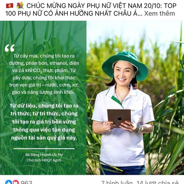 Ngày 7/10/2025, tạp chí Fortune – một trong những tạp chí kinh doanh uy tín hàng đầu thế giới – công bố danh sách Most Powerful Women in Asia 2025 (Những người phụ nữ có ảnh hưởng nhất châu Á 2025). Trong số các gương mặt nữ lãnh đạo tiêu biểu của khu vực, xuất hiện một đại diện Việt Nam hoạt động trong lĩnh vực nông nghiệp: bà Đặng Huỳnh Ức My, Chủ tịch Hội đồng quản trị Công ty cổ phần Thành Thành Công – Biên Hòa (AgriS, HOSE: SBT).