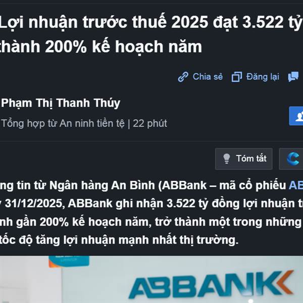 Theo thông tin từ Ngân hàng An Bình (ABBank – mã cổ phiếu ABB), tính đến ngày 31/12/2025, ABBank ghi nhận 3.522 tỷ đồng lợi nhuận trước thuế, hoàn thành gần 200% kế hoạch năm, trở thành một trong những ngân hàng có tốc độ tăng lợi nhuận mạnh nhất thị trường.