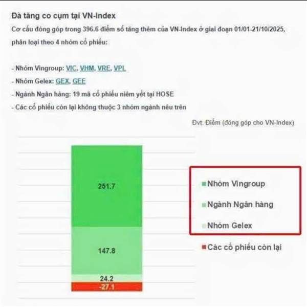 Nhìn biểu đồ( phía bên dưới) cho thấy sự đóng góp vào VN-Index giai đoạn 01/01 – 21/10/2025, anh em sẽ thấy một điều rất...Thêm