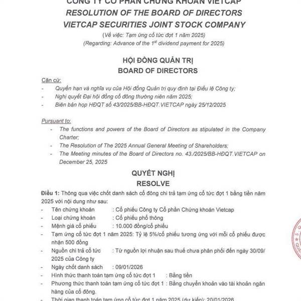Theo báo cáo mới nhất được công bố, VCI sẽ tiến hành chi trả cổ tức cho cổ đông năm 2025 bằng tiền mặt (5%...Thêm