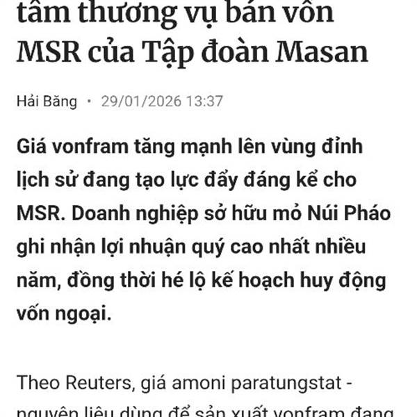 Giá vonfram tăng mạnh lên vùng đỉnh lịch sử đang tạo lực đẩy đáng kể cho MSR. Doanh nghiệp sở hữu mỏ Núi Pháo ghi nhận lợi nhuận quý cao nhất nhiều năm, đồng thời hé lộ kế hoạch huy động vốn ngoại.