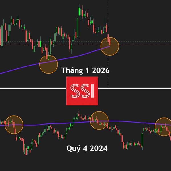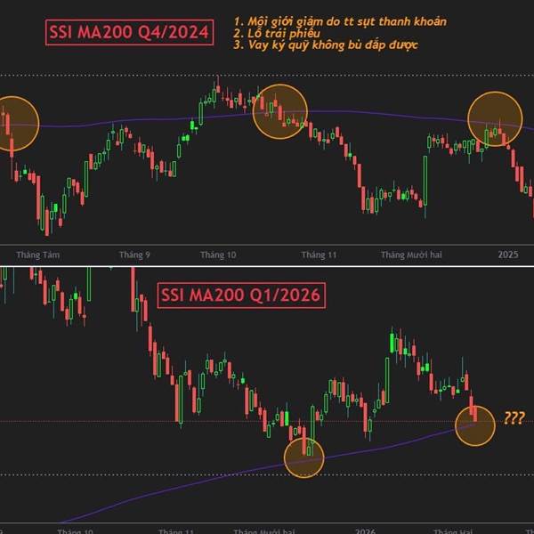 SSI MA200: leader dòng chứng có dẫn dắt được? Lần gần nhất SSI gãy và không vượt nổi MA200 là Q4 2024: thanh khoản thị trường giảm, lỗ trái phiếu Q1/2026: đã hồi 1 lần thành công, còn lần thứ hai???