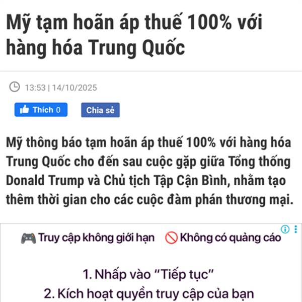 Mỹ thông báo tạm hoãn áp thuế 100% với hàng hóa Trung Quốc cho đến sau cuộc gặp giữa Tổng thống Donald Trump và Chủ tịch Tập Cận Bình, nhằm tạo thêm thời gian cho các cuộc đàm phán thương mại.