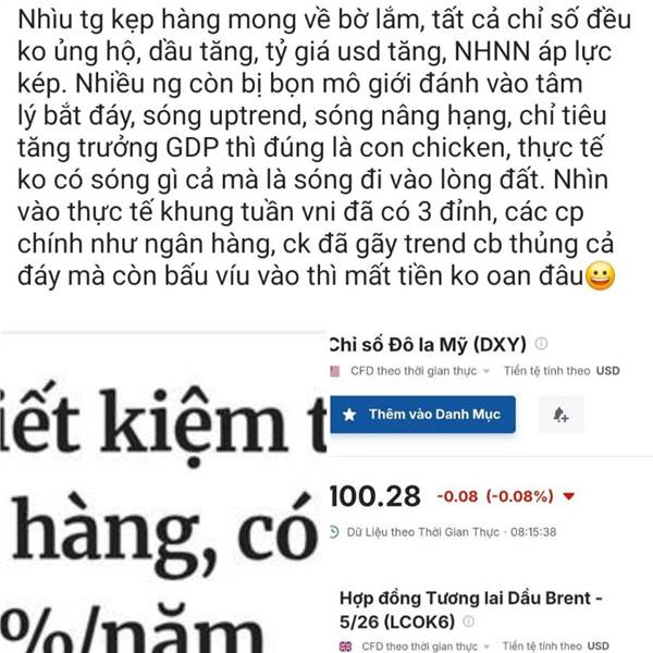 Nhìu tg kẹp hàng mong về bờ lắm, tất cả chỉ số đều ko ủng hộ, dầu tăng, tỷ giá usd tăng, NHNN áp lực kép. Nhiều ng còn bị bọn mô giới đánh vào tâm lý bắt đáy, sóng uptrend, sóng nâng hạng, chỉ tiêu tă...Thêm