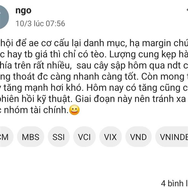 Đã cảnh báo ae trước đó và ngày 10/3 cũng nhắc lại nên tránh xa nhóm tài chính. Ai nghe m đã đỡ đc dịp vừa r bay hơn 10%. Đừng tin vào nào là nâng hạng, tiền số, GDP tăng trưởng 2 con số...tất cả chỉ ...Thêm