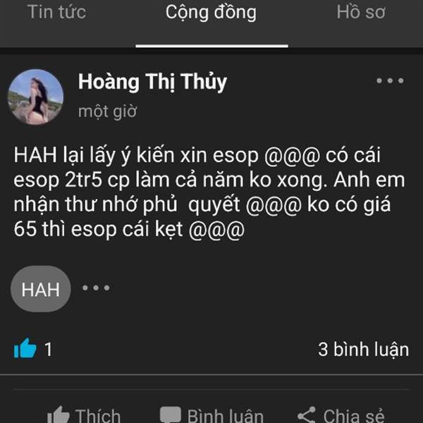 HAH lại lấy ý kiến xin esop @@@ có cái esop 2tr5 cp làm cả năm ko xong. Anh em nhận thư nhớ phủ quyết @@@ ko có giá 65 thì esop cái kẹt @@@