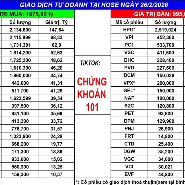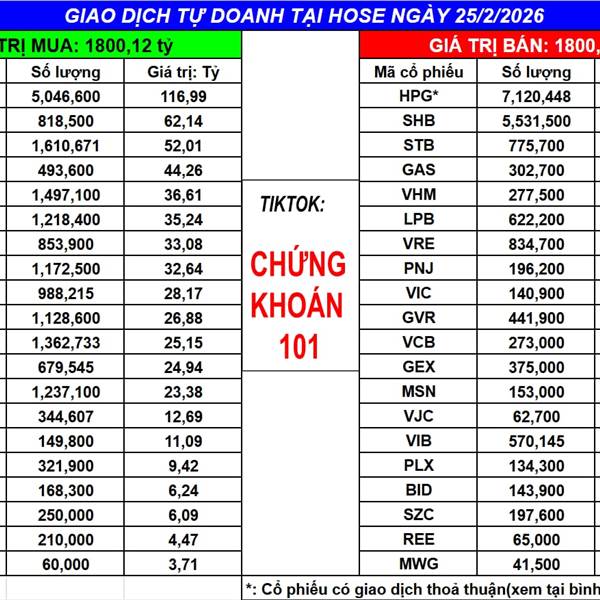 Ngày 26/2/2025 tự doanh MUA ròng: 680.87 tỷ (bao gồm khớp lệnh và thỏa thuận)
