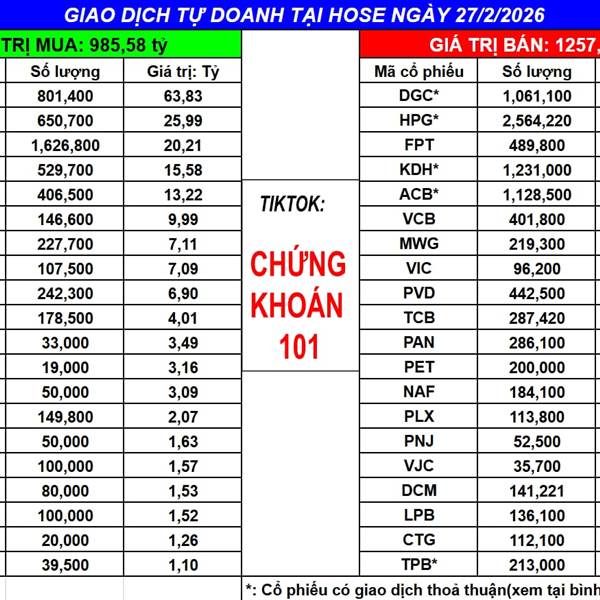 Ngày 27/2/2025 tự doanh BÁN ròng: -272 tỷ (bao gồm khớp lệnh và thỏa thuận)
