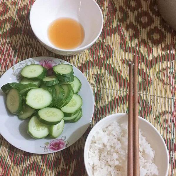 Trong lúc chờ cổ tức lái kéo về bờ, em ăn tạm ít cơm nguội dưa chuột chấm nước mắm.