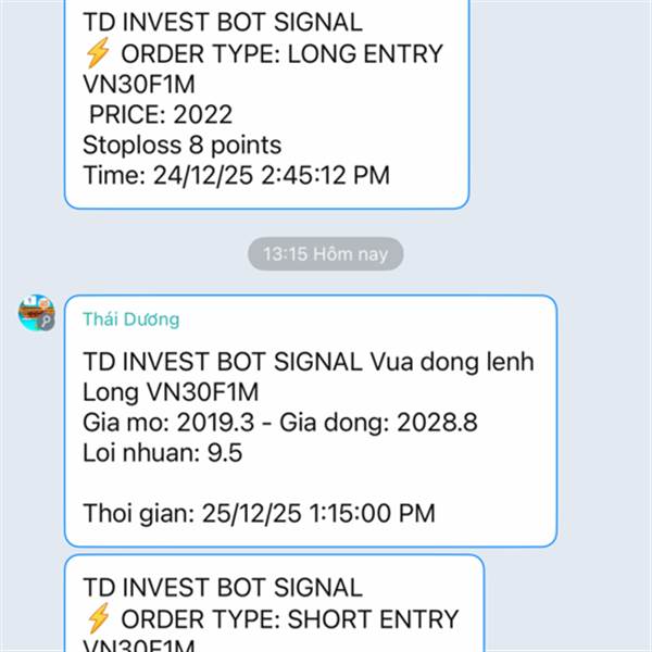 📌 TD INVEST | TỔNG KẾT PHÁI SINH 2025 Hành trình giao dịch phái sinh năm 2025 của TD Invest Algo Bot Trading chính thức khép lại với một dấu ấn tích cực. Hệ thống đã kết thúc năm bằng lệnh Long VN30, m...Thêm