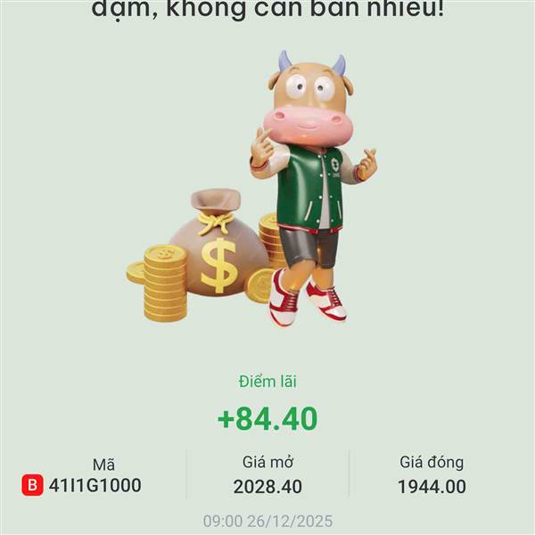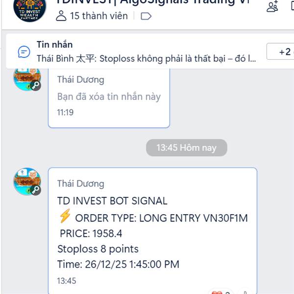 📌 TD INVEST – CẬP NHẬT LỆNH LONG CHIỀU 26/12/2025 Chiều ngày 26/12/2025, hệ thống TD INVEST Algo đã kích hoạt lệnh Long VN30F1M quanh vùng 1958.x, dựa trên tín hiệu kỹ thuật đạt ngưỡng xác suất theo c...Thêm