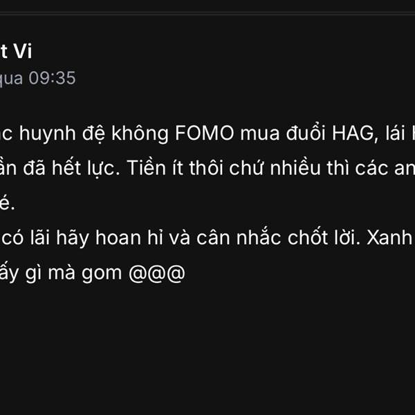 Nhắc nhở các huynh đệ không FOMO mua đuổi HAG, lái HAG sau phiên kéo trần đã hết lực. Tiền ít thôi chứ nhiều thì các anh cũng đẩy lên 2x rồi nhé. Anh em nào có lãi hãy hoan hỉ và cân nhắc chốt lời. Xan...Thêm