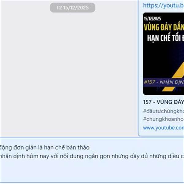 Tâm lý chung của NĐT hiện tại vẫn khá chán nản và nghi ngờ khi chứng kiến liên tiếp các nhịp điều chỉnh/rung lắc của TT nhưng đây được xem là những nhịp rũ bỏ cuối cùng. Đó cũng là lý do mà tháng 12 t...Thêmhttps://youtu.be/hnM_47Kgdvs?si=5JRKaNsH-N1ZgLPu