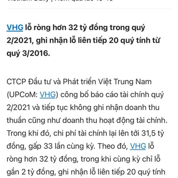 Lỗ liên tiếp 20 quý.Ban lãnh đạo đúng là lừa đảo,lấy tiền của nhà đầu tư,không làm mà muốn có ăn,có doanh thu.