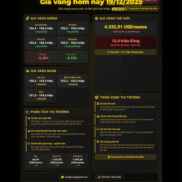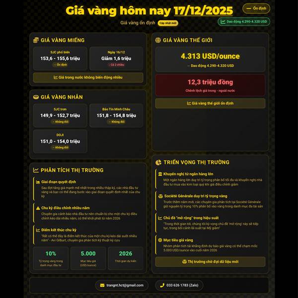 📈🌍 GIÁ VÀNG HÔM NAY (17/12/2025): VÀNG THẾ GIỚI TĂNG MẠNH, VÀNG TRONG NƯỚC KHÔNG NHIỀU THAY ĐỔI