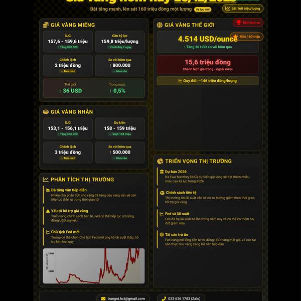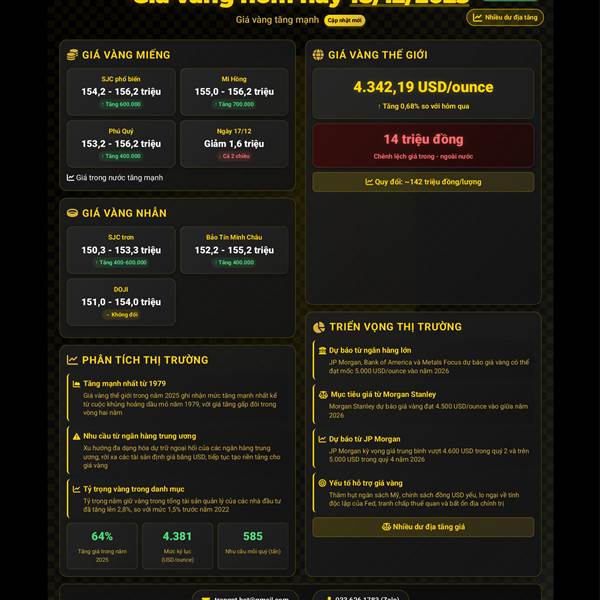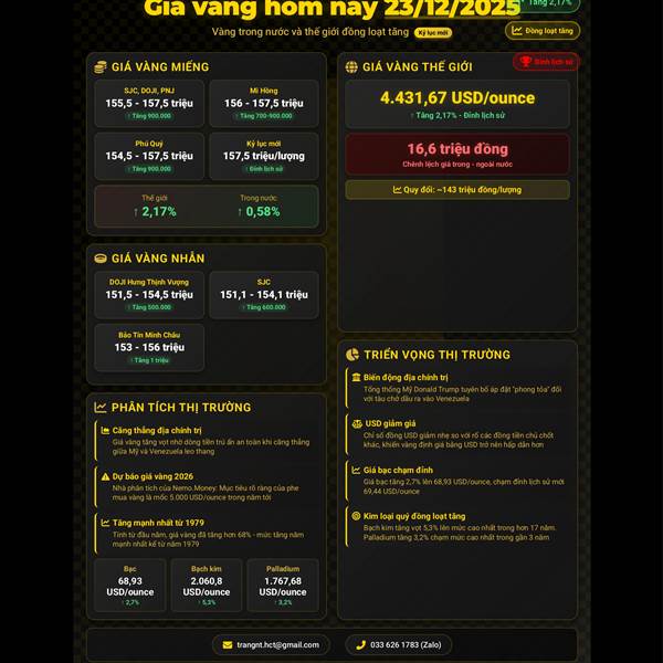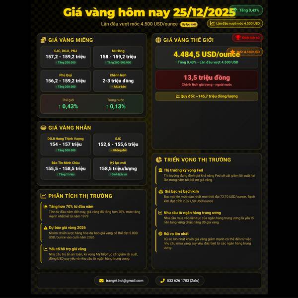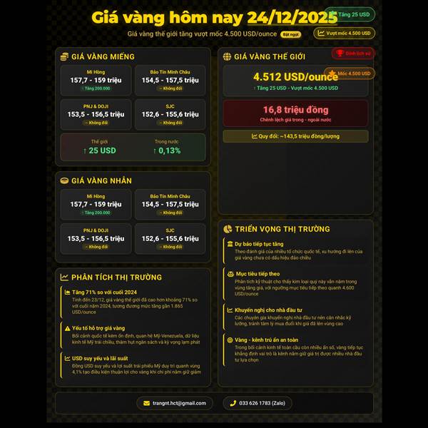 🪙 GIÁ VÀNG HÔM NAY (24/12/2025): GIÁ VÀNG THẾ GIỚI TĂNG VƯỢT MỐC 4.500 USD/OUNCE, VÀNG TRONG NƯỚC TIẾP ĐÀ TĂNG