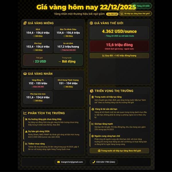 📉📈 GIÁ VÀNG HÔM NAY (22/12/2025): NHẪN GIẢM, THỊ TRƯỜNG VIỆT NĂM "BÁM" THEO THẾ GIỚI?