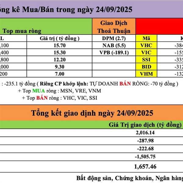 Tự Doanh ngày 24/09/2025 - Tự Doanh BÁN RÒNG : -235.1 tỷ đồng Riêng CP khớp lệnh : TỰ DOANH BÁN RÒNG : -70 tỷ đồng + Top MUA ròng : MSN, VRE, VNM + Top BÁN ròng : VHC, VIC, SSI