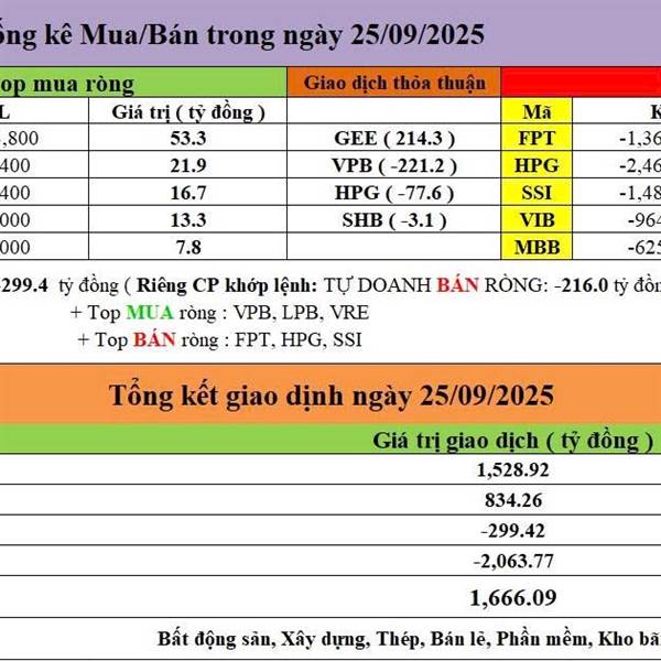 Tự Doanh ngày 25/09/2025 - Tự Doanh BÁN RÒNG : -299.4 tỷ đồng Riêng CP khớp lệnh : TỰ DOANH BÁN RÒNG : -216.0 tỷ đồng + Top MUA ròng : VPB, LPB, VRE + Top BÁN ròng : FPT, HPG, SSI