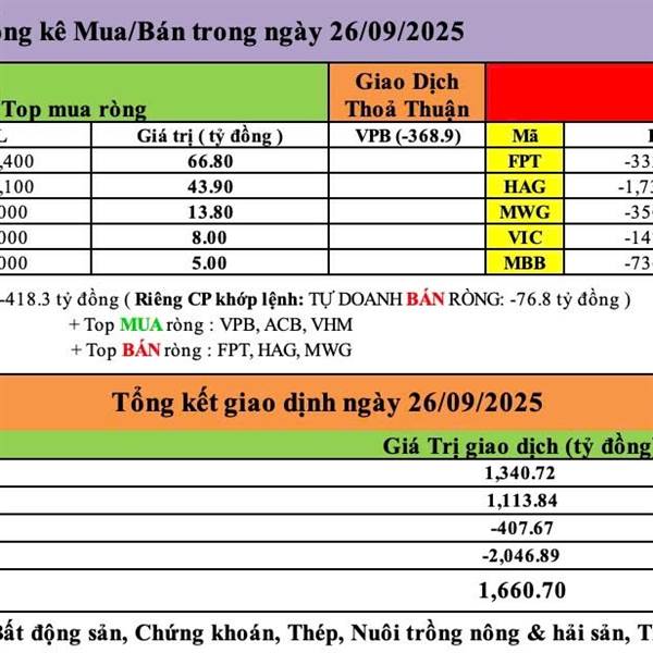 Tự Doanh ngày 26/09/2025 - Tự Doanh BÁN RÒNG : -418.3 tỷ đồng Riêng CP khớp lệnh : TỰ DOANH BÁN RÒNG : -76.8 tỷ đồng + Top MUA ròng : VPB, ACB, VHM + Top BÁN ròng : FPT, HAG, MWG