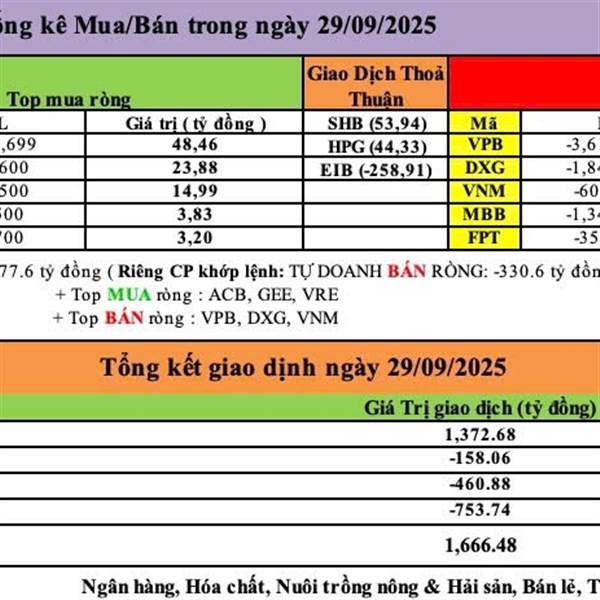 Tự Doanh ngày 29/09/2025 - Tự Doanh BÁN RÒNG : -477.6 tỷ đồng Riêng CP khớp lệnh : TỰ DOANH BÁN RÒNG : -330.6 tỷ đồng + Top MUA ròng : ACB, GEE, VRE + Top BÁN ròng : VPB, DXG, VNM