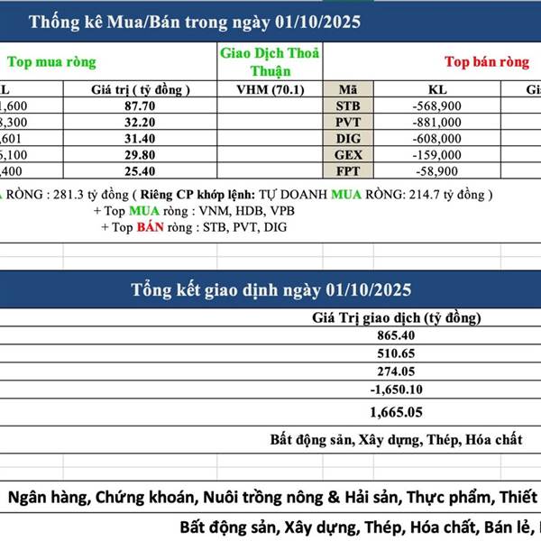 Tự Doanh ngày 01/10/2025 - Tự Doanh MUA RÒNG : 281.3 tỷ đồng Riêng CP khớp lệnh : TỰ DOANH MUA RÒNG : 214.7 tỷ đồng + Top MUA ròng : VNM, HDB, VPB + Top BÁN ròng : STB, PVT, DIG