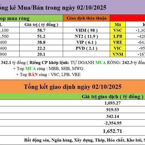 Tự Doanh ngày 02/10/2025 - Tự Doanh MUA RÒNG : 342.1 tỷ đồng Riêng CP khớp lệnh : TỰ DOANH MUA RÒNG : 242.3 tỷ đồng + Top MUA ròng : MBB, SHB, MWG + Top BÁN ròng : VSC, LPB, VRE