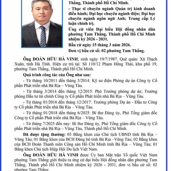 Đ/c Đoàn Hữu Hà Vinh - Bí thư Đảng ủy, Phó Tổng Giám đốc Công ty CP Phát triển nhà BR-VT (HODECO) ứng cử đại biểu HĐND Phường Tam Thắng nhiệm kỳ 2026 -2031 tại đơn vị bầu cử số 02 gồm các khu phố 7, 9...Thêm