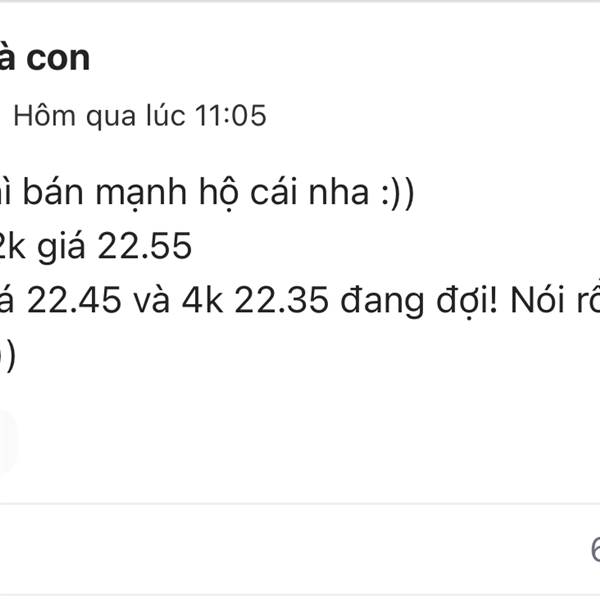 Tiền trong túi anh em mà, quyết định trong tay anh em, bán thì bán đi, tui vẫn đợi để mua! Hơi đâu post status dữ vậy! Đa số mấy ông post thì toàn cầm giá cao đợi về bờ thôi, nhưng mồm thì xạo *** hô ...Thêm